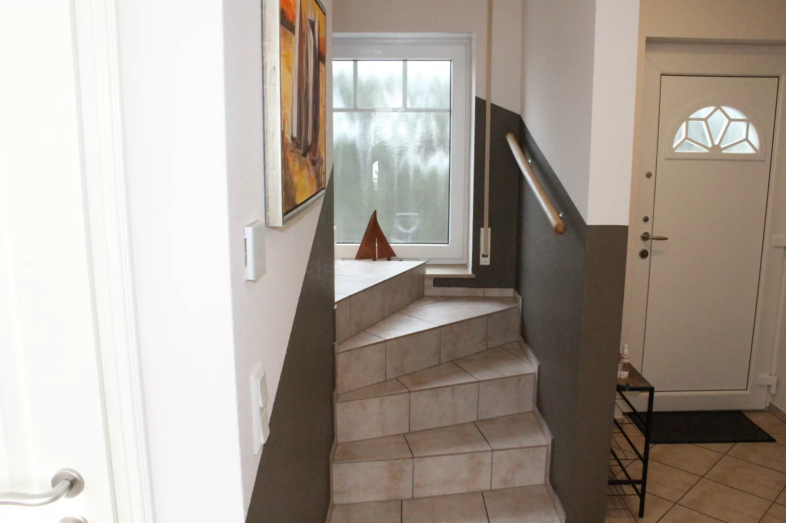 Die Treppe ist gefliest, mit Handlauf.