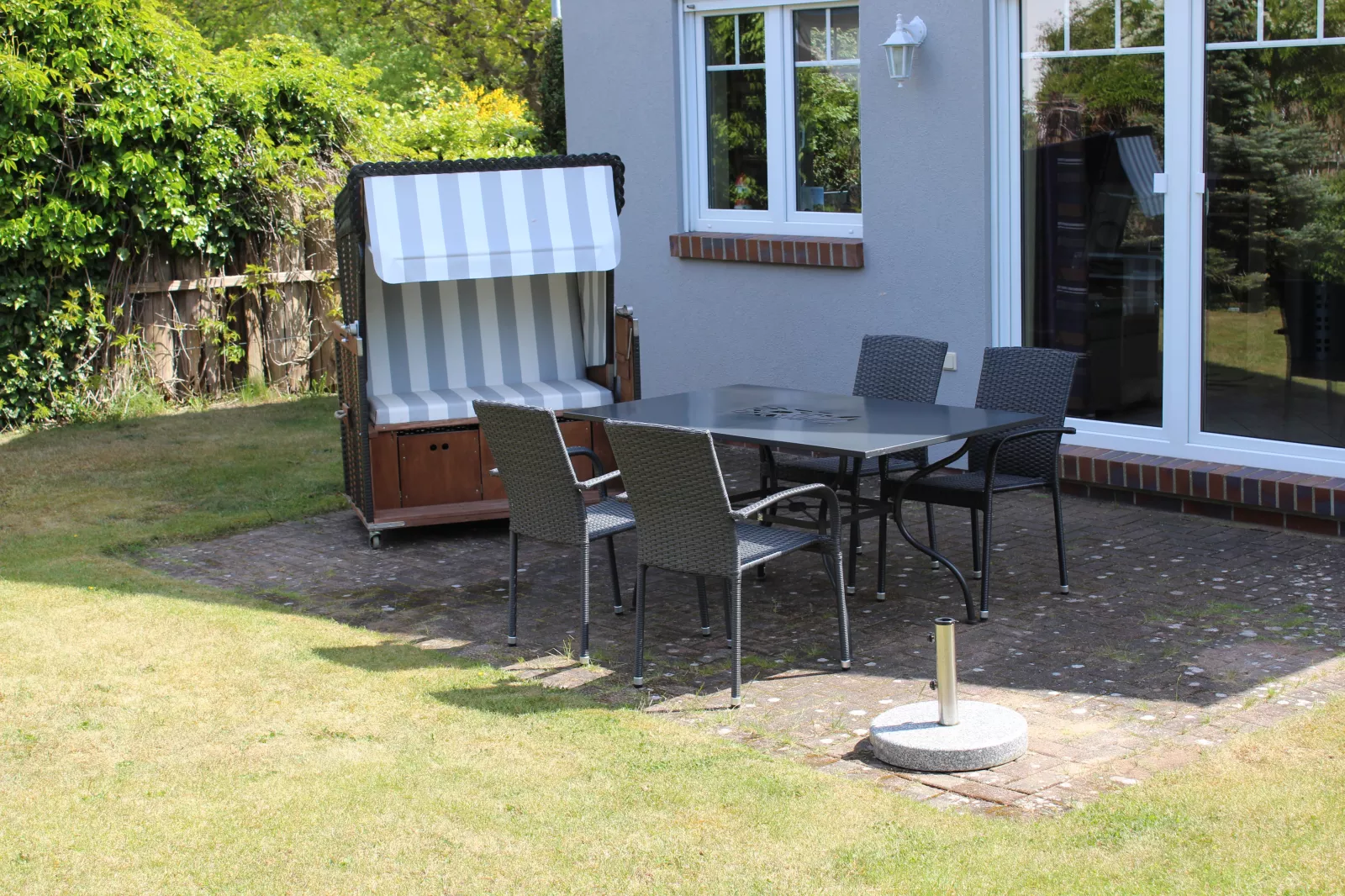 Terrassenmöbel mit 4 Stühlen, Sonnenschirm und Strandkorb