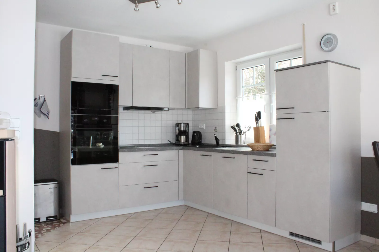 Kühlschrank mit Gefrierfach, Mikrowelle, Geschirrspüler, Herd mit Backofen, Kaffeemaschine, Wasserkocher, Toaster