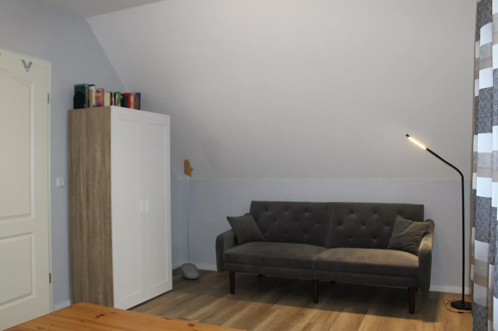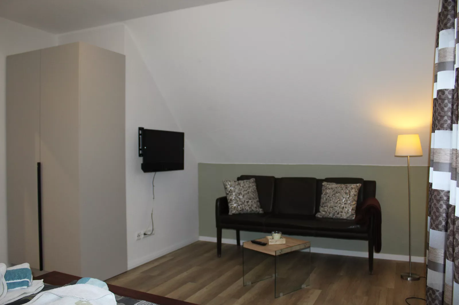 Schlafzimmer mit Doppelbett, großer Kleiderschrank und Relaxsofa