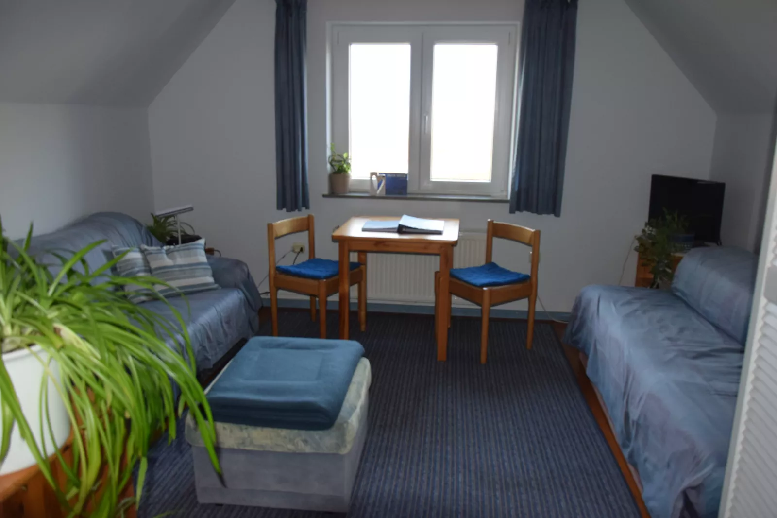 Aus dem Dachfenster auf das Meer und in den Himmel blicken. Gemütlich vor dem Fenster sitzen und den Blick nach Süden mit Wolken … und Meer genießen.